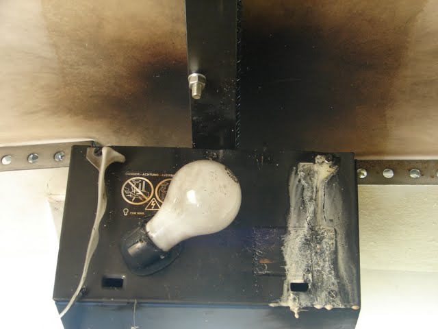 We have come to realize that the plastic cover on these garage door openers is actually OPEN on the top, I assume to prevent the light bulb from getting too hot. BUT this allows birds to then build nests inside the cover, right on top of the light bulb! Which one did. Then when Shawn opened the garage door that day, the light bulb turned on, and the bulb caught the nest on fire... causing this fire.